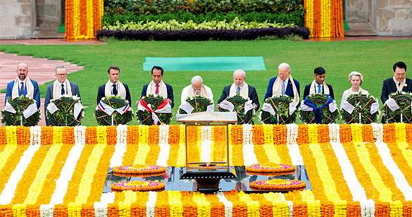 राजघाट पहुंच कर जी-20 शिखर सम्मेलन में आए प्रमुख मेहमानों ने गांधी जी को दी श्रद्धांजलि
