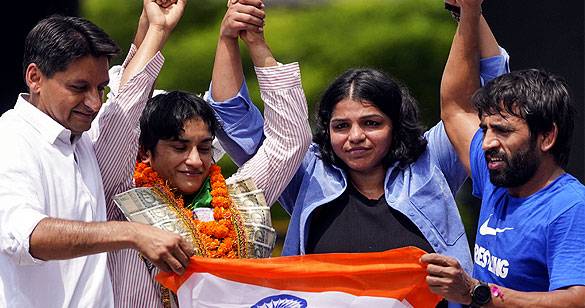 पेरिस ओलंपिक से लौटी विनेश, साक्षी मलिक और बजरंग पूनिया ने किया स्वागत
