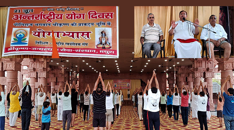 अंतर्राष्ट्रीय योग दिवस पर श्रीकृष्ण जन्मस्थान के लीलामंच प्रांगण में किया गया योगाभ्यास