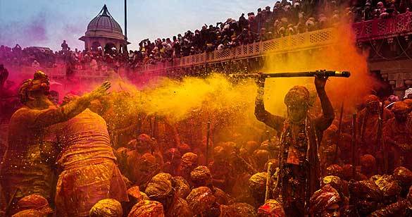 बरसाना में लट्ठमार होली, हुरियारिनों ने हुरियारों पर बरसाईं लाठियां, हेलीकॉप्टर से बरसे फूल