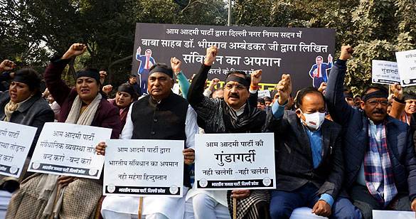 दिल्ली में LG हाउस के बाहर AAP का प्रदर्शन, BJP ने दिया राजघाट पर धरना