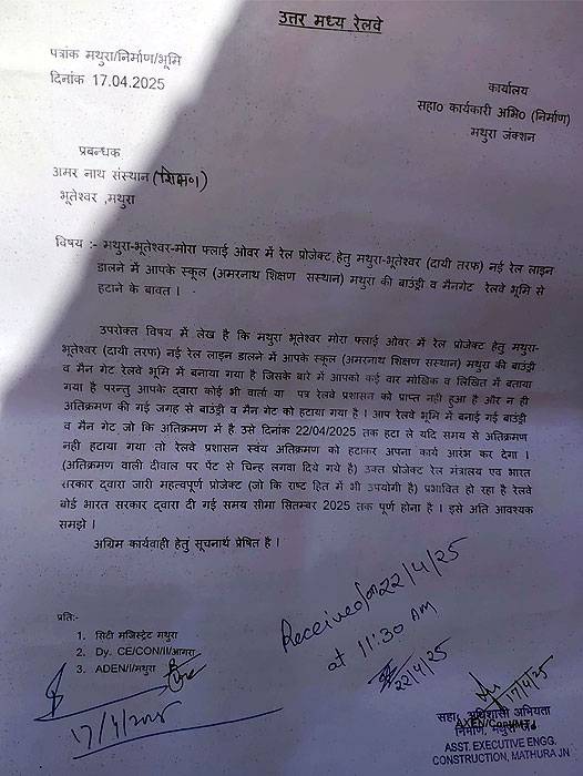 दरअसल, भूतेश्वर रेलवे स्टेशन से मथुरा जंक्शन तक इन दिनों रेलवे अपनी चौथी लाइन बिछाने का कार्य कर रहा है लेकिन इस कार्य में कैलाश नगर तथा अमरनाथ विद्या आश्रम द्वारा किया गया अतिक्रमण बाधा बन रहा था।