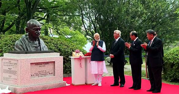 जापान के हिरोशिमा में पीएम मोदी ने किया महात्मा गांधी की प्रतिमा का अनावरण