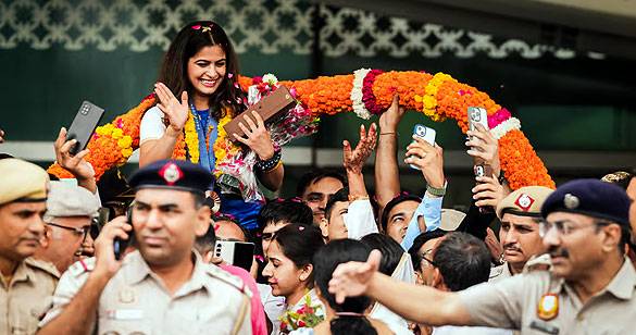 स्वदेश लौटी पेरिस ओलंपिक पदक विजेता निशानेबाज मनु भाकर, जोरदार स्वागत