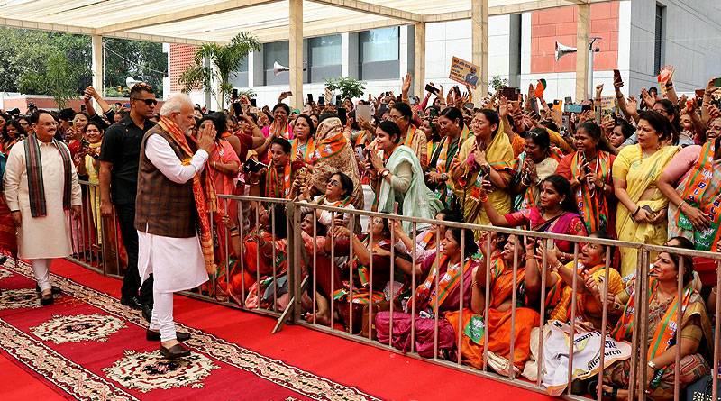 BJP मुख्यालय में रहा आज जश्न का माहौल, महिलाओं ने प्रधानमंत्री नरेंद्र मोदी का अभिनंदन किया