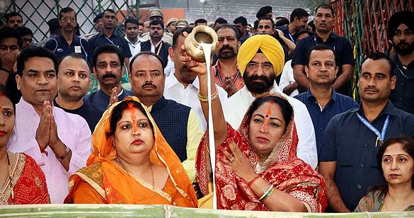 दिल्ली की मुख्यमंत्री रेखा गुप्ता ने हाथी घाट पर दिया उगते सूर्य को अर्घ्य